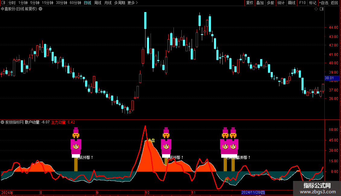 指标融合了随机指标(KDJ)变体、动量对比和相对强弱判断,用于捕捉潜在底部启动机会。通过监测短期价格在近期高低区间中的位置,结合长期与短期均线关系,识别“见底预警”信号。同时,利用散户与主力动量的背离与金叉,判断资金流向变化:当主力动量上穿散户动量且处于低位时,视为上涨启动;若叠加动量回升或极端低位,则触发买入提示。整体策略侧重于在市场情绪低迷、主力悄然介入时提前布局。