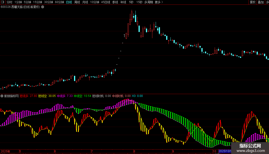 XG:短线时机 AND 中线时机 AND 短线多>中线多 AND DYNAINFO(4)>0,COLORCYAN,NODRAW;