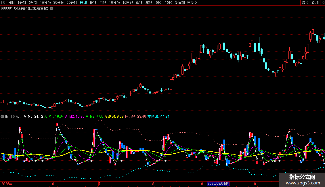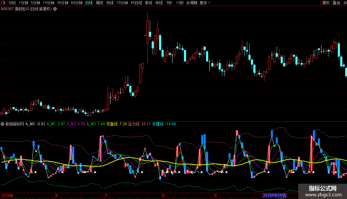 DRAWTEXT(CROSS(KML,0) AND A_M1<变盘线 AND KML<变盘线,0-0.8,'↖★'),COLORWHITE;