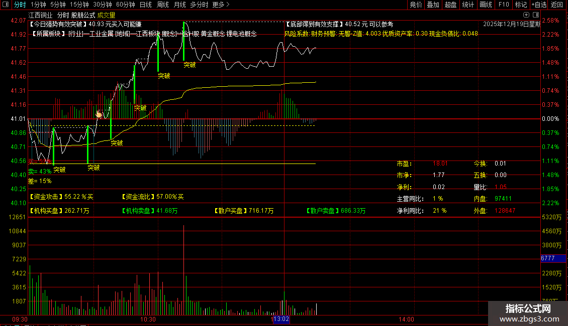 本“分时突破”指标聚焦日内交易,融合资金流、量价关系、MACD及财务数据等多维度信息,核心追踪资金攻击力度、机构/散户买卖盘占比,同时标定分时突破位、支撑位,还嵌入财务预警、估值数据等关键信息,全方位判断个股日内强弱与突破机会,帮助投资者精准识别拉升、冲涨停信号。