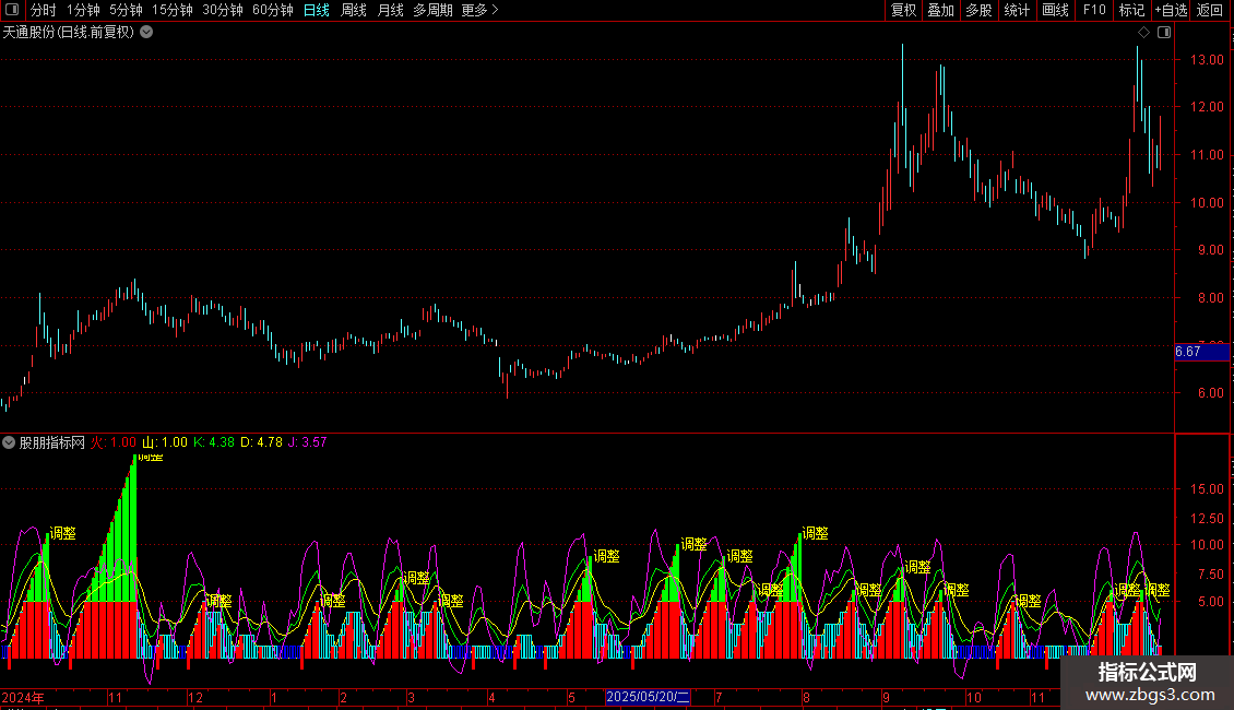 DRAWTEXT(REF(火,3)>0 AND REF(火,2)>0 AND REF(火,1)>0 AND 火=0 AND REF(火,1)>山,REF(火,1),'调整'),COLORYELLOW , ;