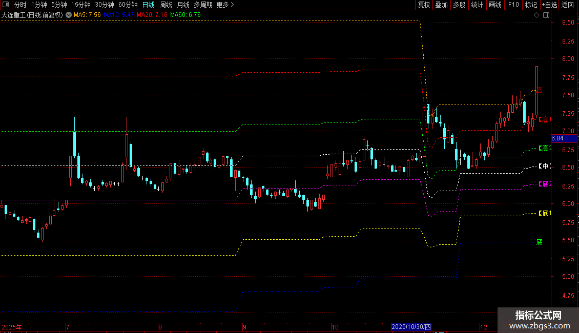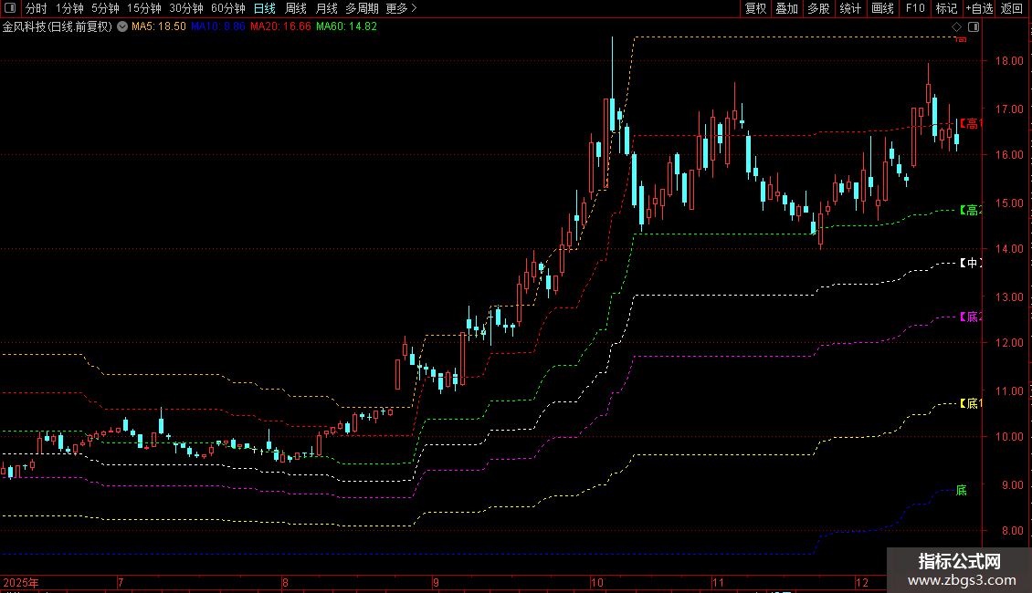 指标主要功能是绘制近期价格区间的高低点,并在此基础上划分多个关键支撑与阻力位,采用常见的黄金分割比例进行水平线标记。这些分位线有助于观察价格在回调或反弹过程中可能遇到的支撑或压力位置。操作上,投资者可结合价格接近这些分位时的走势反应,辅助判断短期买卖时机或设置止盈止损点。
