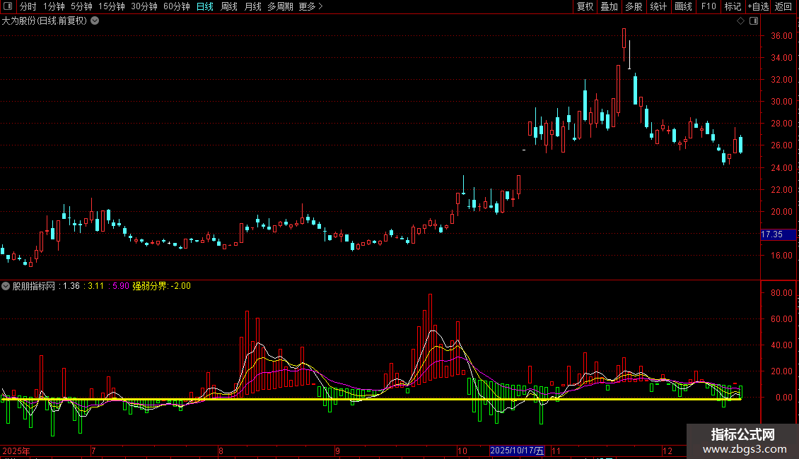 指标通过对比当前与前期筹码获利比例的变化,结合成交量方向,构建一个反映主力资金流入或流出的“筹码强弱”信号。当短期筹码能量上穿其长期均值时,视为资金积极介入,以红色柱体提示偏强;反之则为资金流出,用绿色柱体提示偏弱。配合多条平滑均线和固定强弱分界线,帮助判断市场情绪处于强势还是弱势区域,辅助决策低吸或高抛时机。