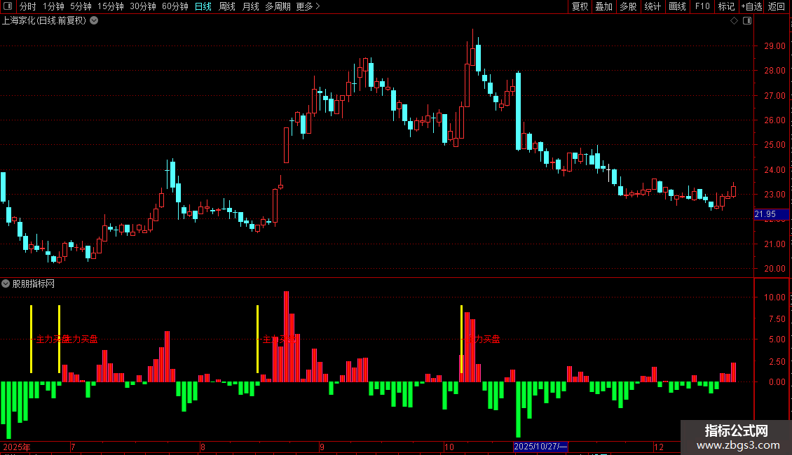 指标通过价格与短期均线的偏离程度构建“主力筹码”能量柱,用红绿颜色区分多空力量,并结合多条平滑均线捕捉主力资金异动。当主力筹码处于低位且出现特定交叉、持续弱势后快速回升等组合条件时,判定为潜在底部区域,触发“主力买盘”信号,提示可能的反弹机会。操作上适合在信号出现时结合市场环境轻仓试多,尤其关注超跌后的反转时机。