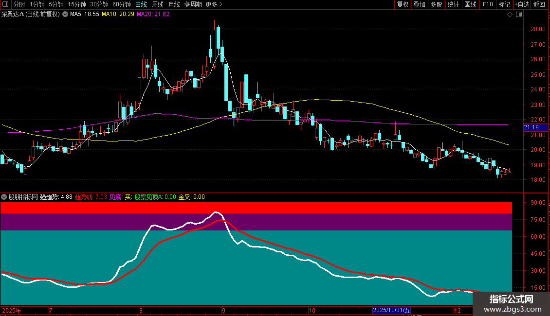金叉:IF(CROSS(强趋势,趋势线)&&趋势线< 60,趋势线,0),NODRAW,COLORYELLOW;