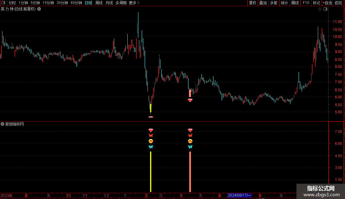 当满足核心条件时,公式会以粉黄双色K线+底部预警图标发出明确信号,辨识度极高。