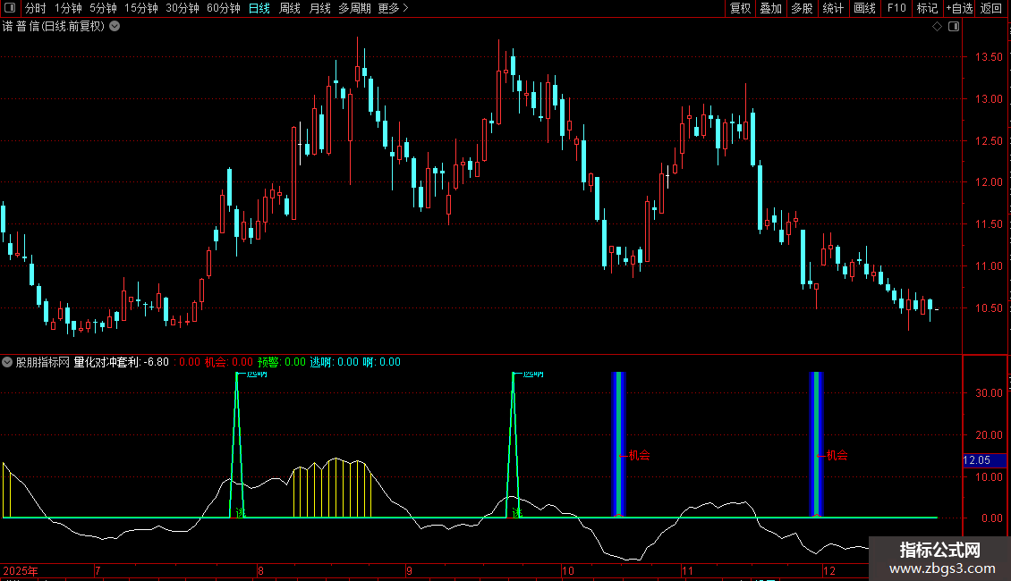 2. 底部机会信号:结合KDJ金叉(J上穿0轴)与三重均线乖离率(ZBGS5 ≤ -7),触发红色“←机会”提示,精准锁定低吸良机;