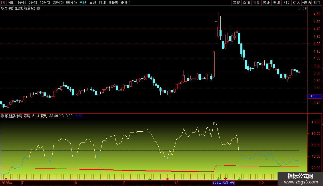 指标主要结合筹码分布、价格位置、均线系统和量价关系,用于判断市场强弱与潜在买卖点。通过分析成本集中度与获利盘比例,识别主力控盘程度;同时利用多周期均线、支撑压力线及特殊K线形态,辅助捕捉低位反弹或突破机会。当出现黄色柱状标记或“3成仓”提示时,视为阶段性低吸信号,适合轻仓介入;而ZIG转向图标则提示短期趋势拐点,可用于波段操作参考。