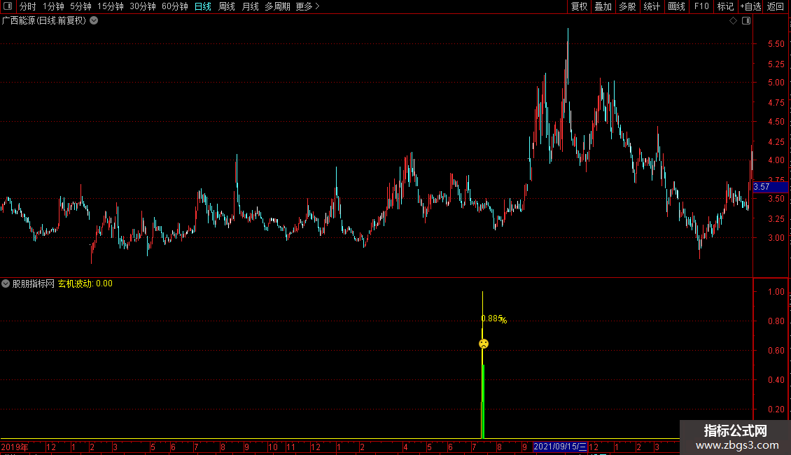 1.玄机波动指标针对尾盘使用,信号三天前的收盘价不高于加权均价,两天前收阴线且收盘价低于加权均价,昨日收阳线收盘价≥加权均价,当天收阴线。