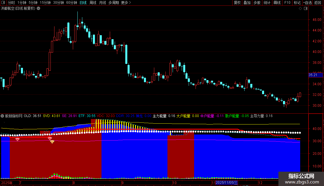 当满足条件VDC>OLDANDDDR>OLD时,在ETF和OLD位置之间画柱状线,宽度为0.5,0不为0则画空心柱.,画黄色