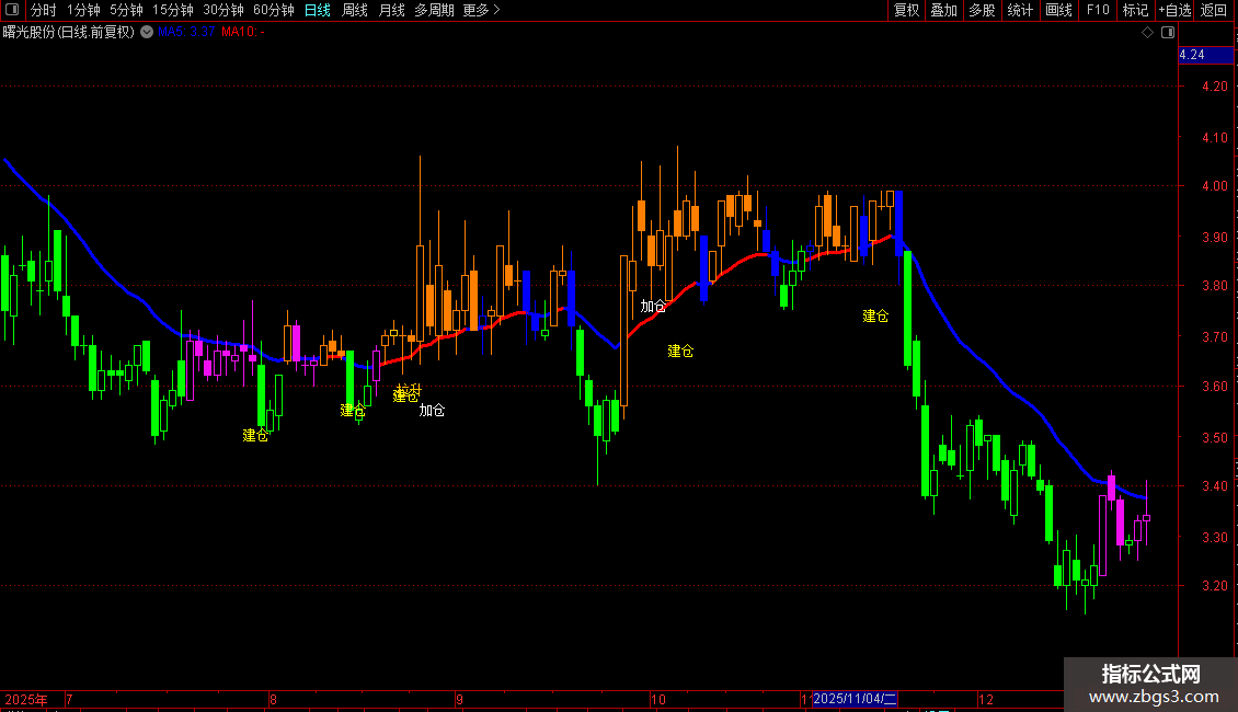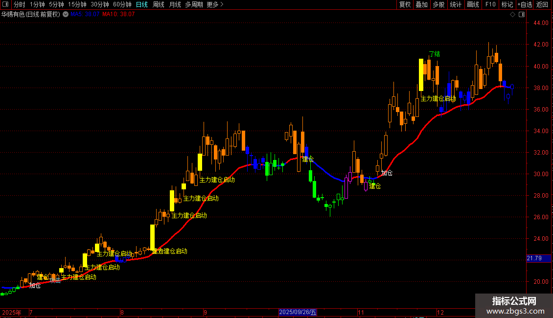 建仓信号:当短期均线(MA9)上穿中期均线(MA20),图中出现黄色“建仓”提示,代表主力初步介入。