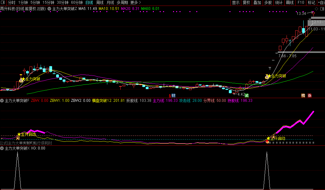 本套公式由主图、副图与选股三部分组成,专为识别主力资金强势介入、横盘蓄势后的突破行情而设计。