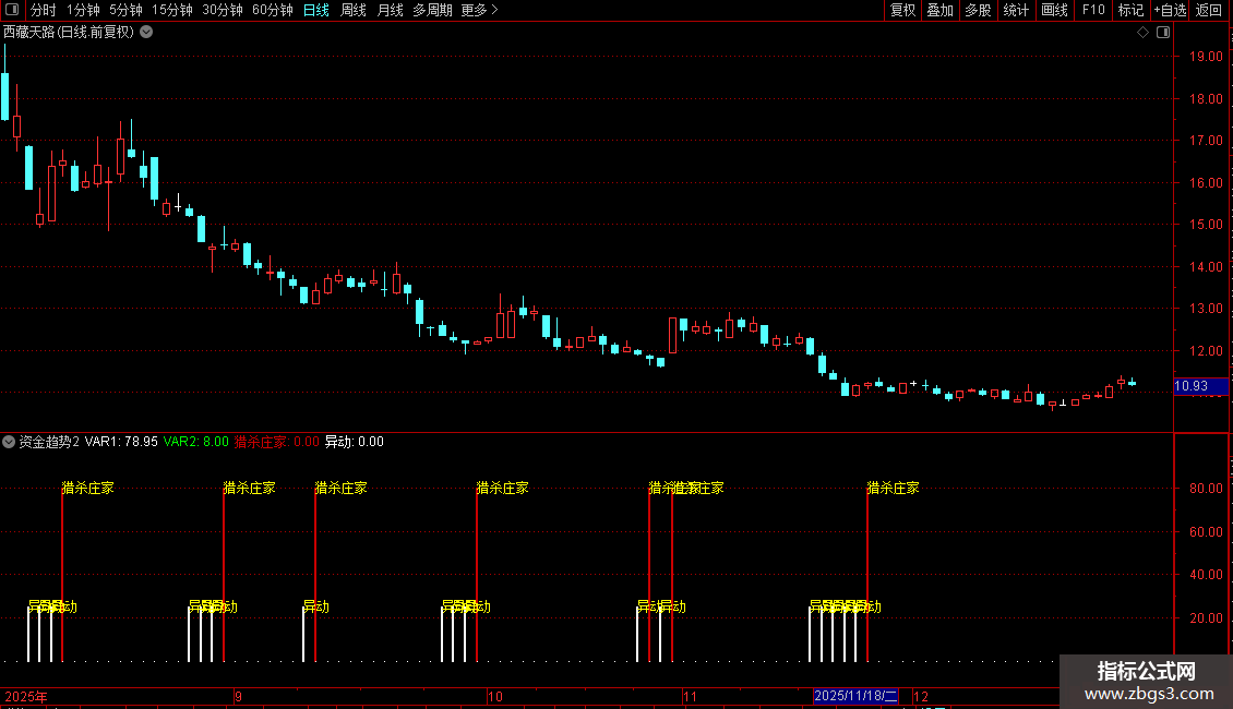 指标通过比较股价在近期高低点区间中的相对位置,构建出两条平滑曲线,用以捕捉短期价格动能的变化。当快线向上突破预设阈值时,视为强势信号,提示“猎杀庄家”;当指标回落至低位区域,则标记为“异动”,暗示市场可能出现异常波动或主力动作。整体策略偏向短线交易,适用于震荡或启动初期的行情识别。
