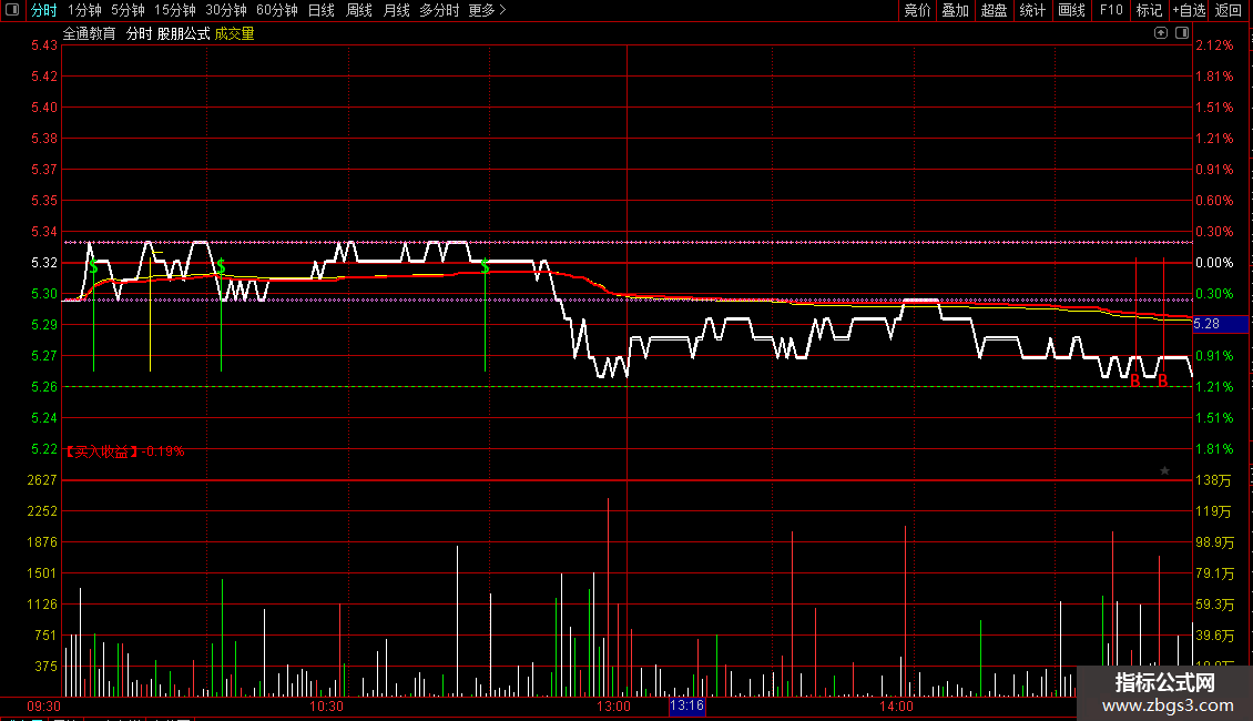 分时启动:=C;ZBGS突破1:HHV(H,480),DOTLINE,COLORRED;STICKLINE(FILTER(CROSS(C,REF(ZBGS突破1,1)),10) AND C>REF(ZBGS突破1,1),C*0.99,C,8,0),COLORGREEN;DRAWTEXT(FILTER(CROSS(C,REF(ZBGS突破1,1)),10) AND C>REF(ZBGS突破1,1),C*0.99,''),COLOR0080FF;现价:C,COLORWHITE,LINETHICK2;均价11:SUM(C*V,240)/SUM(V,240),COLORRED,LINETHICK2;TT:=BARSCOUNT(C); 前高:=REF(HHV(H,TT),1); 突破:=CROSS(C,REF(HHV(H,TT),1)) AND C/均价11< 1.09 AND TT>1 AND TT< 240;主力扫盘:=COUNT(突破,13)>=3 AND CROSS(C,REF(HHV(H,TT),1));DRAWTEXT(主力扫盘,前高, '←'),COLORYELLOW;已主力扫盘:=BARSLAST(主力扫盘)< 13;全仓买进:=CROSS(C,REF(HHV(H,TT),1)) AND HHVBARS(VOL,TT)=0 AND C/均价11< 1.09 AND TT>1 AND TT< 240 AND BARSLAST(主力扫盘)>=20;DRAWTEXT(全仓买进 ,前高, '←全仓'),COLORCYAN;分时追踪2:=DYNAINFO(4)>0 AND HHV(HIGH,2)/LLV(LOW,2)< 1.25 AND REF(分时启动,1)< LLV(LOW,3)+(HHV(HIGH,3)-LLV(LOW,3))*0.85;分时追踪9:=EMA(分时启动,2);分时追踪10:=EMA(分时启动,3);分时追踪11:=MAX(分时追踪9,分时追踪10); X2:=分时启动>分时追踪11 AND 分时追踪2 AND (分时启动>REF(HHV(HIGH,2),1) AND (分时启动-REF(分时启动,1))/REF(分时启动,1)>0.015) AND (V/CAPITAL<=0.2) AND C/REF(C,1)< 1.07; NX:=MA(((SLOPE(C,20)*5)+C),10); B1:=HOUR=09 AND MINUTE=45;B20:=LLV(L,15);B30:=BARSLAST(B1);B4:=REF(B20,B30);B5:CONST(B4),COLORFF80FF,CIRCLEDOT,LINETHICK2; C1:=HOUR=09 AND MINUTE=45;C2:=HHV(H,15);C3:=BARSLAST(C1);C4:=REF(C2,C3);C5:CONST(C4),COLORFF80FF,CIRCLEDOT,LINETHICK2; DIF:=EMA(分时启动,12)-EMA(分时启动,26);DEA:=EMA(DIF,9);MACD10:=(DIF-DEA)*2;AA0:=MACD10>00 AND DIF>0 AND DEA>0; A100:=HOUR=10 AND MINUTE=0;A20:=HHV(H,30);A30:=BARSLAST(A100);A40:=REF(A20,A30); A50:=CONST(A40);A80:=分时启动>A50 AND REF(C<=A50,1) AND 分时启动>NX;AB:=FILTER(A80,100);A90:=DYNAINFO(3);AC:=分时启动<=A90*1.04 AND 分时启动>A90;量比:=V/REF(MA(V,5),1);ZBGS突破:=AA0 AND AB AND AC AND A40>A90 AND 量比>=1;DRAWICON(ZBGS突破,A50,23);DRAWTEXT(FILTER(CROSS(C,REF(ZBGS突破,1)),10) AND C>REF(ZBGS突破,1),C*0.995,''),COLORYELLOW;分时追踪4:=分时启动;分时追踪5:=(分时启动-REF(分时启动,5))/REF(分时启动,5);BAB1:=STICKLINE(分时追踪5>0,DYNAINFO(3),DYNAINFO(3)*(1+分时追踪5),0.1,0);BAB2:=STICKLINE(分时追踪5< 0,DYNAINFO(3),DYNAINFO(3)*(1+分时追踪5),0.1,0);分时追踪6:=分时启动/DYNAINFO(3);分时追踪7:=FILTER(分时追踪5>0.015 AND 分时追踪5>REF(分时追踪5,1)*2 AND VOL>REF(VOL,1)*2 AND 分时启动>REF(分时启动,1) OR 分时追踪5>0.025,240);DRAWICON(分时追踪7 AND 分时追踪6< 1.06 AND 分时启动>DYNAINFO(3),C,23);DRAWICON(分时追踪7 AND 分时追踪6< 1.06 AND 分时启动>DYNAINFO(3),C,1);DRAWTEXT(分时追踪7 AND 分时追踪6< 1.06 AND 分时启动>DYNAINFO(3),C,' ')COLORGREEN;H1:=MAX(DYNAINFO(3),DYNAINFO(5));L1:=MIN(DYNAINFO(3),DYNAINFO(6));P1:=H1-L1;阻力:L1+P1*8/9,COLORLIRED,DOTLINE;支撑:L1+P1*0.5/9,COLORGREEN,DOTLINE;DRAWTEXT(LONGCROSS(支撑,C,2),C-0.01,' '),COLOR0000FF;分时捉妖1:=V*C/100;分时捉妖2:=SUM((IF(((分时捉妖1/8>20) AND (分时启动>(REF(分时启动,1)))),分时捉妖1,0)),0);分时捉妖3:=SUM((IF(((分时捉妖1/8>20) AND (分时启动< (REF(分时启动,1)))),分时捉妖1,0)),0);分时捉妖4:=SUM((IF(((分时捉妖1/8< 20) AND (分时启动>(REF(分时启动,1)))),分时捉妖1,0)),0);分时捉妖5:=SUM((IF(((分时捉妖1/8< 20) AND (分时启动< (REF(分时启动,1)))),分时捉妖1,0)),0);主力买盘:=(分时捉妖2); 主力卖盘:=(分时捉妖3);散户买盘:=(分时捉妖4); 散户卖盘:=(分时捉妖5); ZBGS1:=HIGH-REF(HIGH,1);ZBGS2:=REF(LOW,1)-LOW;ZBGS3:=EMA(IF(ZBGS1>0 AND ZBGS1>ZBGS2,ZBGS1,0),28);ZBGS4:=EMA(IF(ZBGS2>0 AND ZBGS2>ZBGS1,ZBGS2,0),28);ZBGS5:=EMA(ZBGS3/TR,28);ZBGS6:=EMA(ZBGS4/TR,28);ZBGS7:=EMA((分时启动+HIGH+LOW)/3,2);ZBGS8:=MAX(DYNAINFO(3),EMA(DYNAINFO(5),5));ZBGS9:=MIN(DYNAINFO(3),EMA(DYNAINFO(6),5));ZBGS10:=(COST(95)+DYNAINFO(11))/2;ZBGS11:=(COST(5)+DYNAINFO(11))/2;ZBGS12:=CONST((ZBGS8+ZBGS10)/2);ZBGS13:=CONST((ZBGS9+ZBGS11)/2);ZBGS14:=(ZBGS12+ZBGS13)/2;ZBGS15:=ZBGS13+ZBGS14-ZBGS12;ZBGS16:=(ZBGS13+ZBGS15)/2;ZBGS17:=(ZBGS15+ZBGS16)/2;ZBGS18:=(EMA(分时启动,24)-EMA(分时启动,52))*4+ZBGS14;ZBGS19:=EMA(ZBGS18,18);MCD:=(ZBGS18-ZBGS19)*2+ZBGS14,NODRAW,COLORYELLOW;ZBGS20:=3*SMA((分时启动-LLV(LOW,54))/(HHV(HIGH,54)-LLV(LOW,54)),3,1)-2*SMA(SMA((分时启动-LLV(LOW,54))/(HHV(HIGH,54)-LLV(LOW,54)),3,1),3,1);ZBGS21:=MEMA(ZBGS20,10);ZBGS22:=EMA(ZBGS21,10);ZBGS23:=IF(EXIST(CROSS(ZBGS12,ZBGS7),5) AND EXIST(分时启动>ZBGS12,10) AND ZBGS21< HHV(ZBGS21,10) AND ZBGS22< REF(ZBGS22,1),1,0);ZBGS24:=IF(EXIST(CROSS(ZBGS7,ZBGS13),5) AND EXIST(分时启动< ZBGS13,10) AND ZBGS21>LLV(ZBGS21,10) AND ZBGS22>REF(ZBGS22,1),1,0);卖出:=ZBGS23=1 AND REF(ZBGS23,1)=0;DRAWICON(ZBGS23=1 AND REF(ZBGS23,1)=0,ZBGS12,8);DRAWICON(ZBGS24=1 AND REF(ZBGS24,1)=0,ZBGS13,7);STICKLINE(ZBGS23=1 AND REF(ZBGS23,1)=0,ZBGS12,ZBGS13,0,0),COLORGREEN; STICKLINE(ZBGS24=1 AND REF(ZBGS24,1)=0,ZBGS12,ZBGS13,0,0),COLORRED;PA2 :=BARSSINCE(卖出)+1;首次卖出价:=REF(C,PA2-1),NODRAW;卖出收益:(DYNAINFO(7)-首次卖出价)/首次卖出价*100,NODRAW,COLORGREEN;虎:= (EXPMA(分时启动,500)-REF(EXPMA(分时启动,500),1))/REF(EXPMA(分时启动,500),1)*100;DRAWICON(CROSS(EXPMA(虎,120)-0.0004,EXPMA(虎,200)),均价11,13);Q:=BETWEEN(C/(SUM(AMOUNT,BARSCOUNT(C))/SUM(VOL*100,BARSCOUNT(C))),1.05,0.95);Q2:=IF(Q=0,MA(C,BARSCOUNT(C)),(SUM(AMOUNT,BARSCOUNT(C))/SUM(VOL*100,BARSCOUNT(C))));YD:=DYNAINFO(3);{HTTP://}MM:=IF(C=DYNAINFO(4)*1.1 AND L=DYNAINFO(4)*1.1,H-YD,H-REF(C,1));M:=IF(MM>0,MM,0.0);SS:=IF(C=DYNAINFO(4)*0.9 AND H=DYNAINFO(4)*0.9,YD-H,REF(C,1)-L);S:=IF(SS>0,SS,0.0);HJ:=M+S;买入力度:=M/HJ*AMOUNT/CAPITAL;卖出力度:=S/HJ*AMOUNT/CAPITAL;N:=7.5;MMA30:=EMA(分时启动,30);强弱界定:=IF(PERIOD=0,EMA(分时启动,900),DRAWNULL),COLORWHITE,LINETHICK2;分时价量线:=SUM(C*V,240)/SUM(V,240),COLORYELLOW,LINETHICK1;实时涨幅限制:=(C/DYNAINFO(3)-1)*100;买卖力度:=SUM((买
