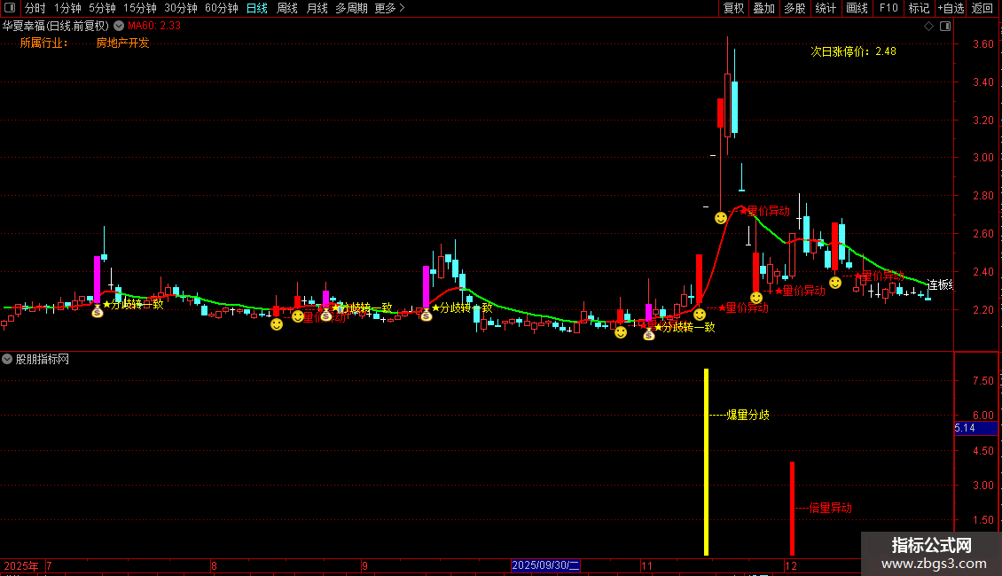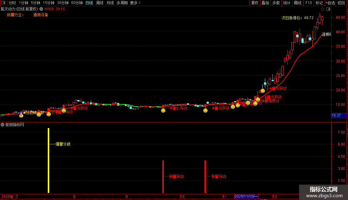指标主要用于识别潜在强势股的启动信号,结合不同股票的涨跌停规则动态计算次日涨停价,并通过价格、成交量与均线系统判断市场情绪和资金动向。当股价放量上涨、收阳线且突破关键均线压力时,视为“分歧转一致”的买入机会;若仅出现明显放量阳线但未满足更强条件,则标记为“量价异动”,提示关注。策略上,投资者可优先关注带★信号的个股,结合行业信息辅助决策。