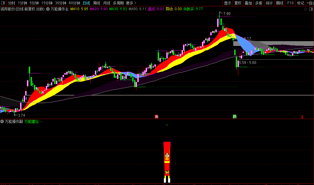 主图主要展示清晰的波段操作参考。图中通过不同颜色的均线带直观显示短、中、长期趋势。核心功能是自动标记“高点”压力和“杀跌买”支撑。当股价突破近期“高点”时,附图标记提示可能打开上行空间。当股价回调至近期“杀跌买”支撑位时,该位置会显示为绿色点状线,提示短线超跌后的潜在买入机会,辅助用户进行高抛低吸。