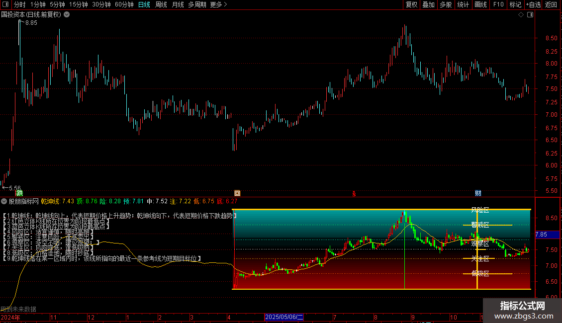 风险:=IFF(判断,REFDATE((天线-地线)*0.809+地线,DATE),DRAWNULL),POINTDOT,LINETHICK3,COLOR66FF00;