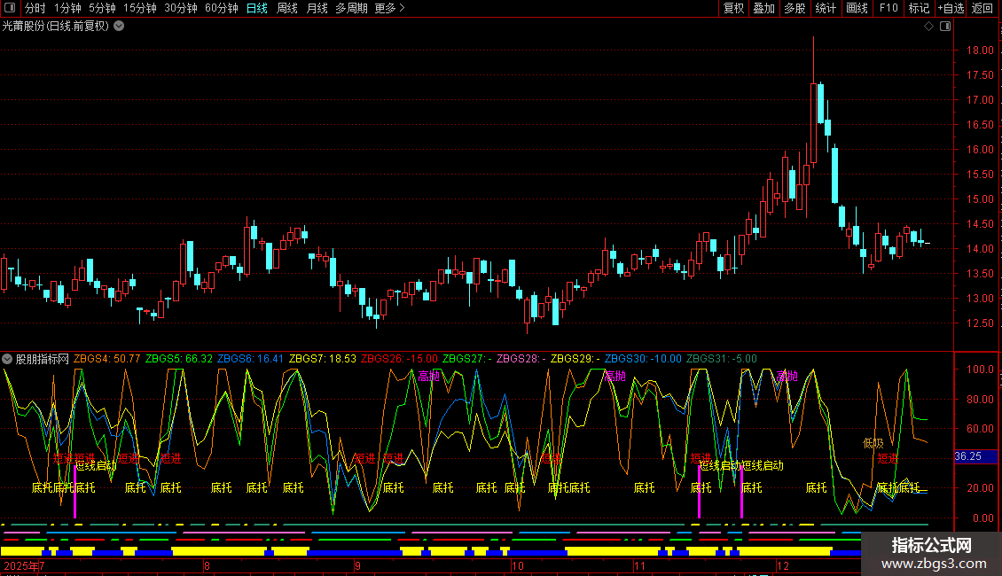 本指标特别适用于3-15日的短线博弈,建议结合成交量验证(如ZBGS22条件)。当多个信号共振(如同时出现"低位启动"+"突破")时胜率最高,但需注意在震荡市中可能出现假信号,建议搭配大盘环境综合判断。