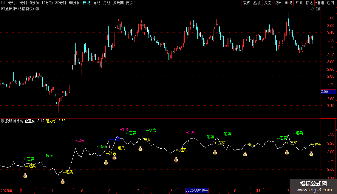 DRAWTEXT(CROSS(VAR3,VAR4) AND BARSLAST(VAR5)>3 ,HIGH+0.1,'←短卖'),COLORGREEN;