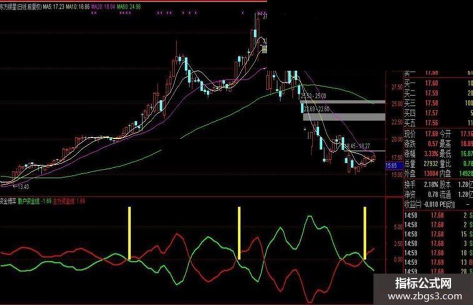 3.黄色柱子为主力资金上穿散户资金线的位置,附带黄柱选股。