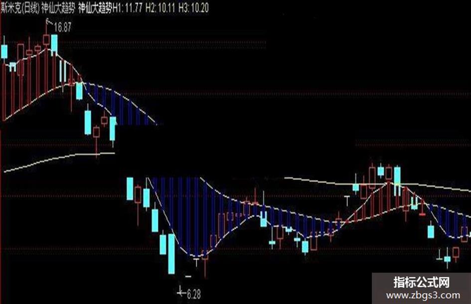 神仙大趋势H1:EMA(CLOSE,6); H2:EMA(神仙大趋势H1,18); H3: EMA (CLOSE,108),COLORYELLOW; STICKLINE(神仙大趋势H1>H2,神仙大趋势H1,H2,1,1),COLORRED; STICKLINE(神仙大趋势H1<H2,神仙大趋势H1,H2,1,1),COLORBLUE;