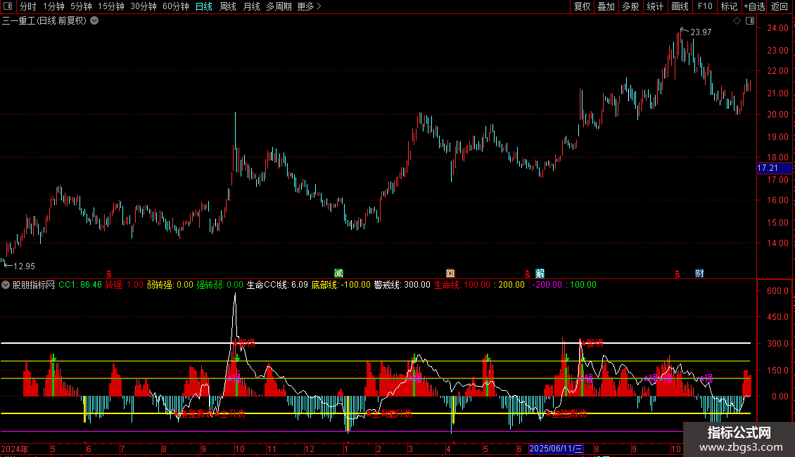 DRAWTEXT(CROSS(生命CCI线,警戒线),警戒线,'★警惕')COLORRED;