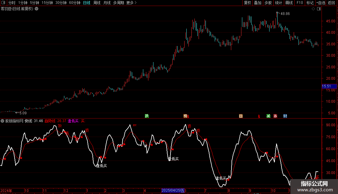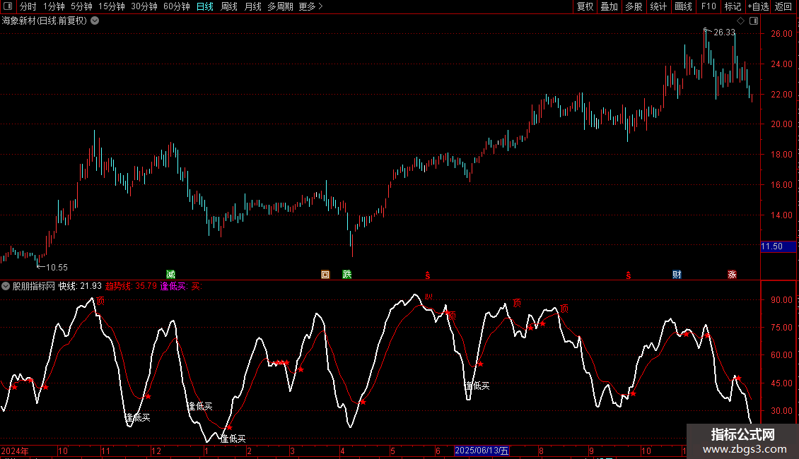 逢低买: DRAWTEXT(REF(CROSS(趋势线,快线),82) AND 趋势线>1.3*快线,快线,'逢低买'),LINETHICK1;