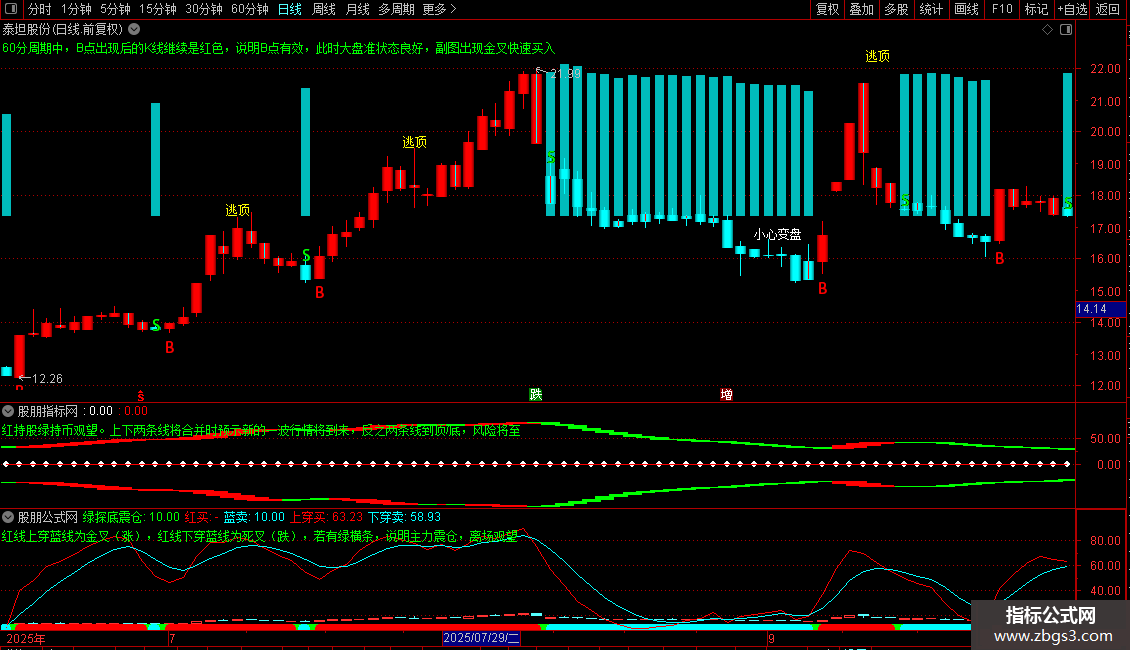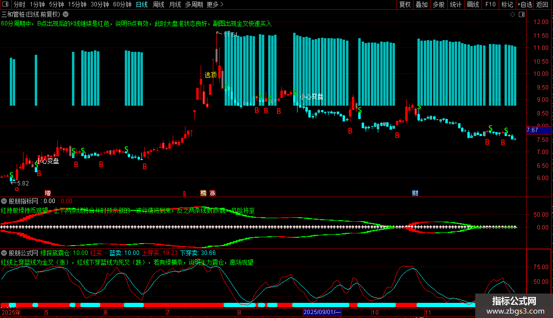 DRAWTEXT_FIX(1=1,0,0,0,'60分周期中,B点出现后的K线继续是红色,说明B点有效,此时大盘准状态良好,副图出现金叉快速买入'),COLORGREEN;