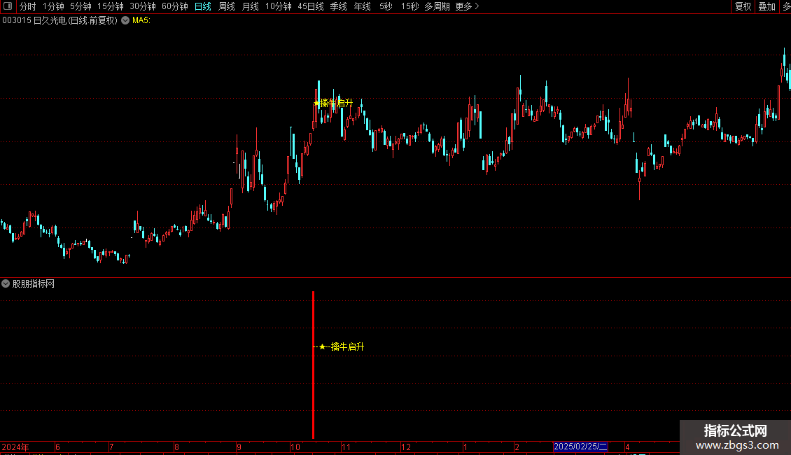 指标旨在识别股价短期强势启动的“擒牛”机会。它综合了价格跳空高开、实体形态合理、上下影线特征、成交量明显放大、股价站稳多条均线、创近期新高等多个技术要素,并结合成本偏离度判断市场热度。当所有条件同时满足时,系统会标记出“擒牛启升”信号,提示投资者关注可能的短线爆发点。