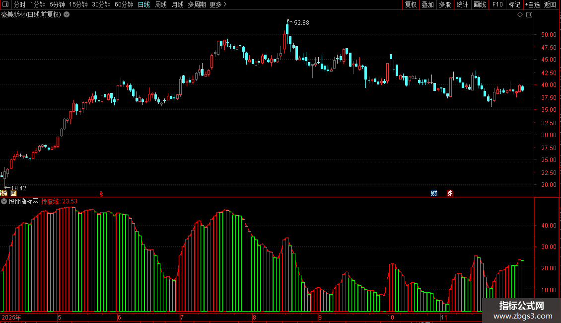 STICKLINE(持股线<REF(持股线,1),0,持股线,3,1),COLORGREEN;