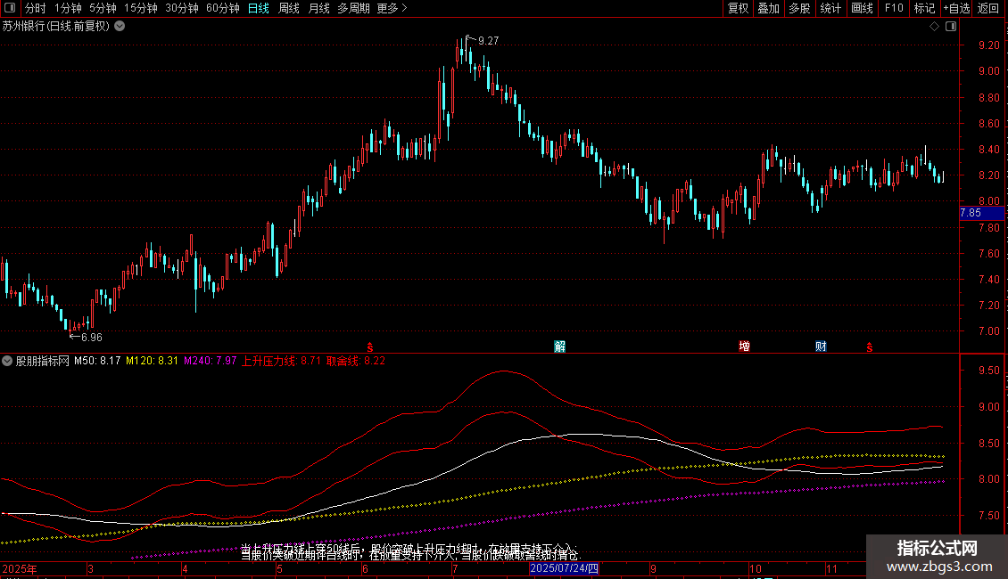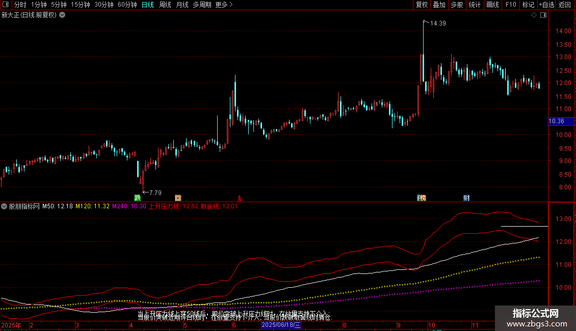 DRAWTEXT_FIX(1,0.25,0.9,0,'当上升压力线上穿50线后,股价突破上升压力线时,在放量支持下介入;');