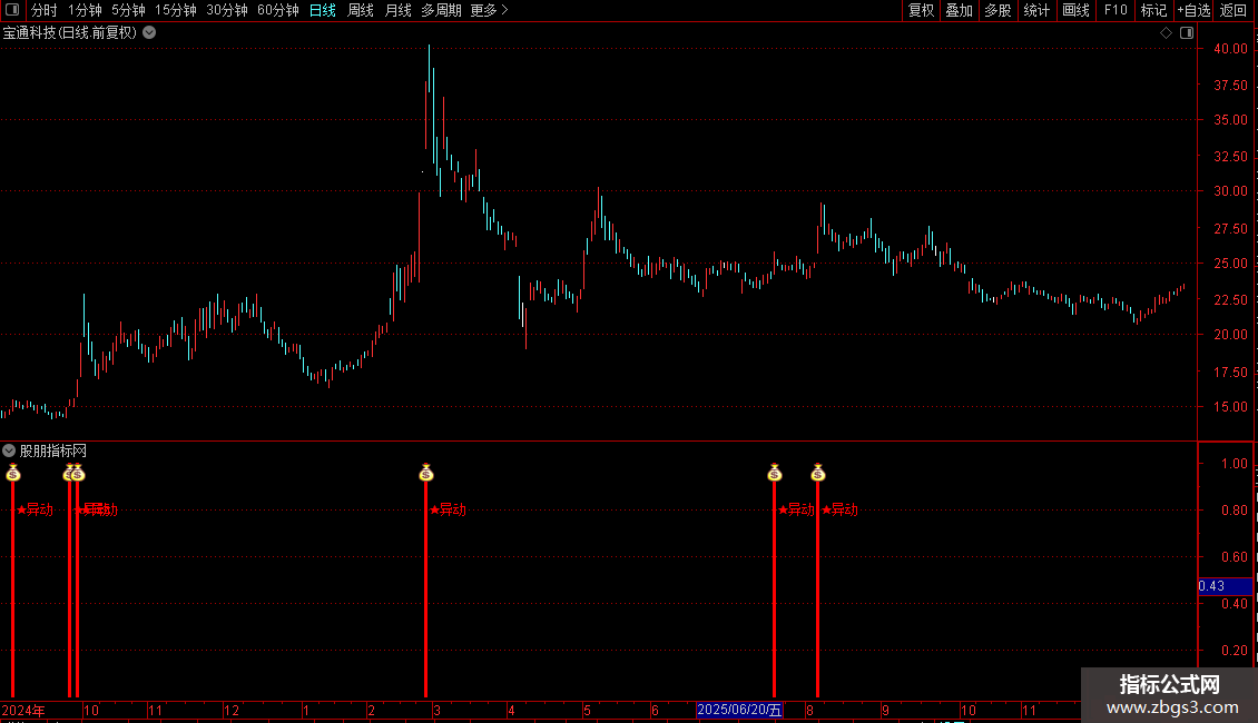 指标主要通过成交量突增、MACD多头状态及短期均线呈多排来识别主力资金异动的初期信号。当股价处于长期均线上方,且出现放量阳线、涨幅不过于极端时,系统会标记为“异动”启动点,提示潜在强势股介入机会。整体策略聚焦于结合量能、趋势与价格位置,捕捉主力开始行动的早期阶段。
