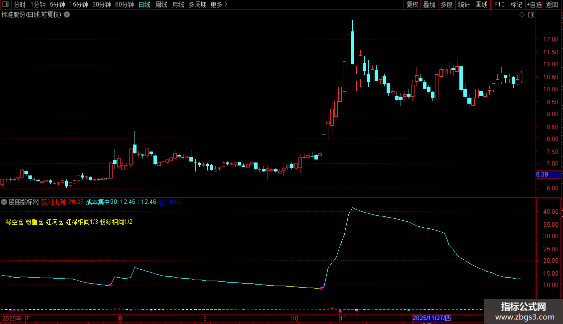 指标主要通过筹码分布函数(如COST和WINNER)分析当前价格下的获利盘比例与成本集中程度,判断市场持仓结构的松紧状态。利用多条自定义“吸筹线”与股价的位置关系,结合价量配合,以不同颜色柱状图直观提示操作策略:例如高位高获利且成本集中度低时可能为重仓信号,而股价低于关键吸筹线则偏向空仓或观望。整体用于识别主力吸筹区域及合适的仓位管理时机。