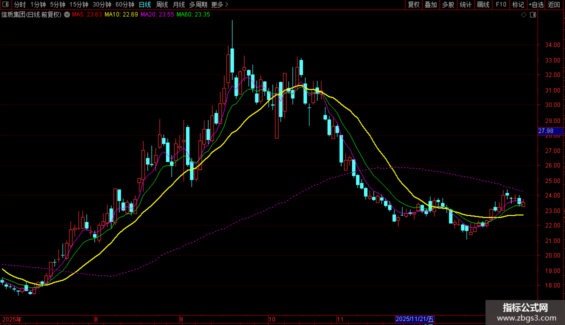 成本线:(5*A1+4*A2+3*A3+2*A4+A5)/15,DOTLINE,COLORMAGENTA;
