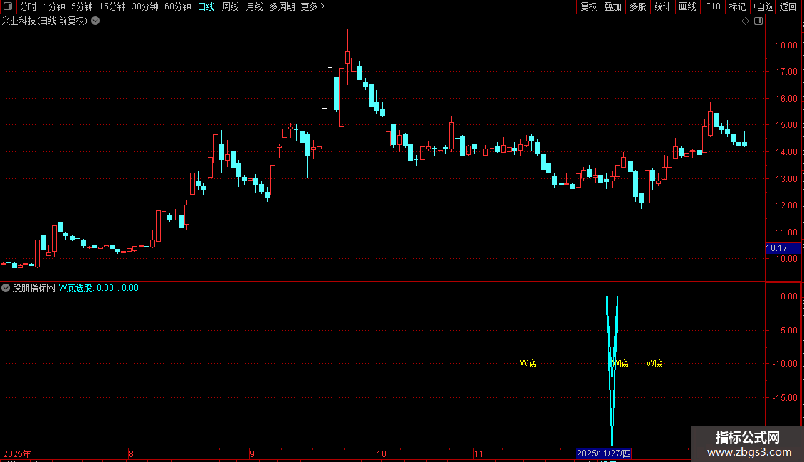 指标基于MACD构建,主要识别特定形态的“W底”反转信号。其核心逻辑是:当DIFF在零轴下方上穿DEA形成金叉,并结合DEA由正转负的背景,系统会累计符合条件的金叉次数;一旦累计次数比历史最高值多出两次,且当前次数较前一日增加,即触发选股信号。此时在图上标记“W底”字样并输出固定数值提示。操作上,投资者可将此作为潜在底部反弹的参考依据,配合其他确认信号择机介入。