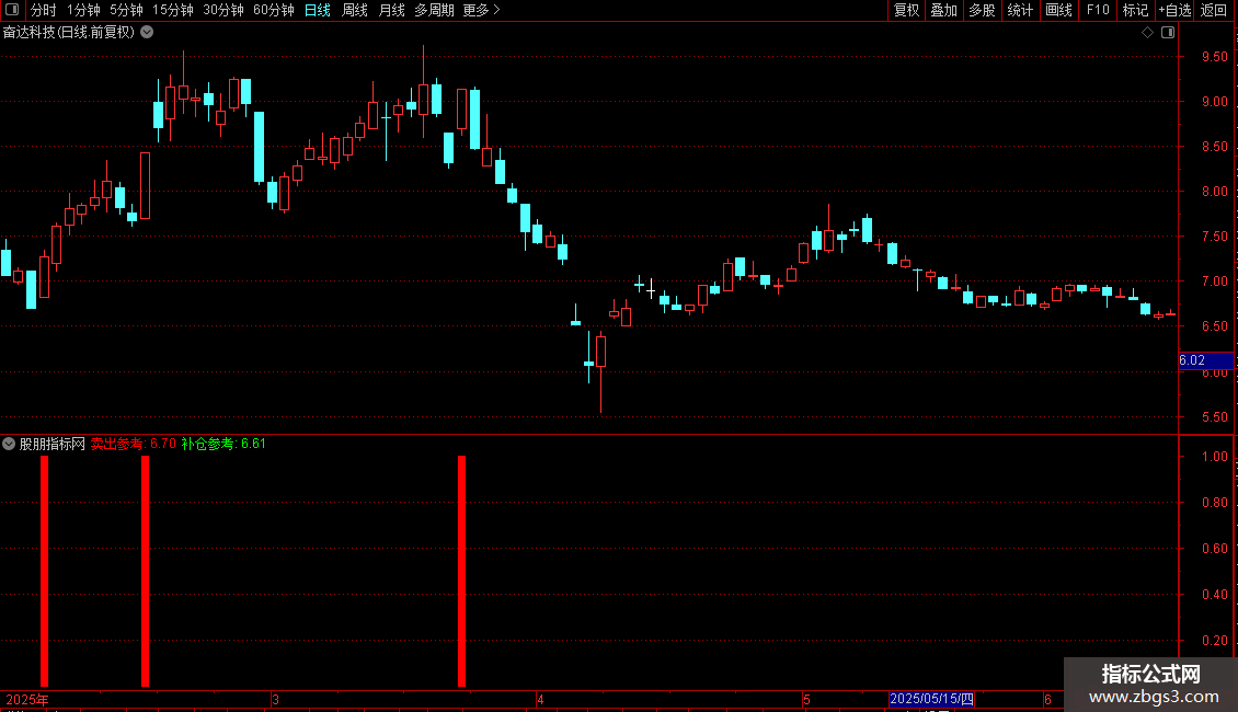 指标主要帮助识别股票短期顶部和底部,提供卖出和补仓参考。通过计算最高价和最低价的移动平均值来设定卖出和补仓的价格参考线,并结合价格突破、相对强弱指标变化等条件判断买入时机。特别地,当市场出现连续弱势后首次强势反转时,会发出明确的买入信号,以蓝色柱状图显示,辅助投资者捕捉短线反弹机会。