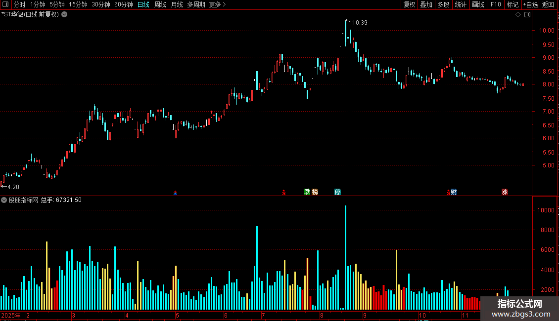输出TDXSTEP458:当满足条件K<30时,在总手和0位置之间画柱状线,宽度为2.5,0不为0则画空心柱.,COLOR000065