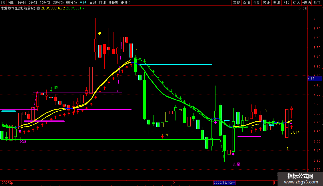 2. 公式自动在K线图右侧显示三组形态标识——分别对应短、中、长期;
