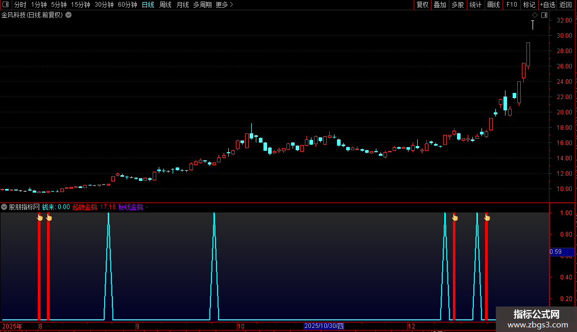 指标主要通过价格变动率和成交量变化的突增来识别潜在强势启动个股,当两者同时出现异常放大时,触发“钱来”信号,提示短期资金异动。此外,结合近期高点与低点结构,绘制出两条关键压力参考线——“起拔金指”和“秘线金指”,当股价向上突破任一参考线时,视为趋势转强的确认信号,适合短线介入。整体策略强调量价突变与关键位突破的双重验证。