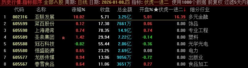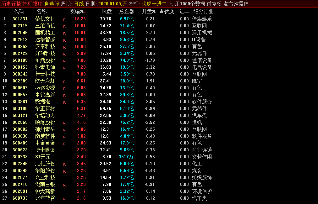 通达信【伏虎一进二】早盘竞价排序 9:25后信号锁定专注于首板晋级二板策略源码
