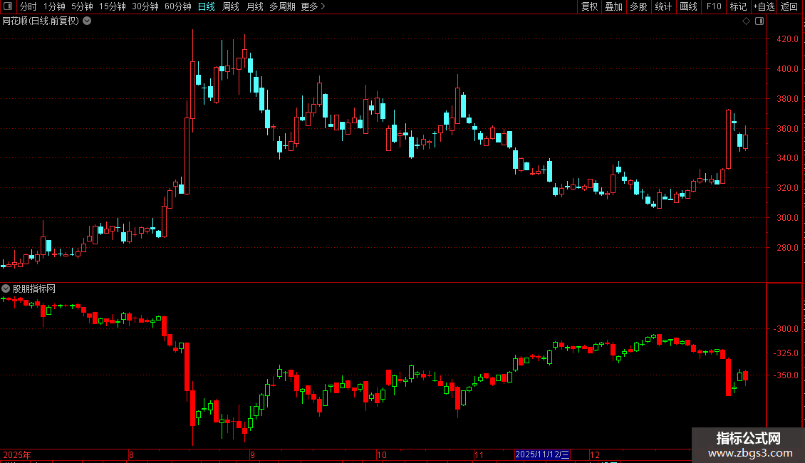 STICKLINE(OPEN<C,0-OPEN,0-C,3,0),COLORRED;STICKLINE(OPEN<C,0-C,0-H,0,0),COLORRED;STICKLINE(OPEN<C,0-L,0-OPEN,0,0),COLORRED;STICKLINE(OPEN>C,0-OPEN,0-C,3,1),COLORGREEN;STICKLINE(OPEN>C,0-H,0-OPEN,0,0),COLORGREEN;STICKLINE(OPEN>C,0-L,0-C,0,0),COLORGREEN;STICKLINE(C>REF(C,1) AND OPEN=C,0-OPEN,0-C,2,1),COLORRED;STICKLINE(C>REF(C,1) AND O=C,0-L,0-H,0,0),COLORRED;STICKLINE(C=REF(C,1) AND O=C,0-O,0-C,2,1),COLORGREEN;STICKLINE(C=REF(C,1) AND O=C,0-L,0-H,0,0),COLORGREEN;STICKLINE(C<REF(C,1) AND O=C,0-O,0-C,2,1),COLORGREEN;STICKLINE(C<REF(C,1) AND O=C,0-L,0-H,0,0),COLORGREEN;{MA5:MA(-C,5),COLORWHITE;MA10:MA(-C,10),COLORYELLOW;MA20:MA(-C,20),COLORMAGENTA,LINETHICK2;MA30:MA(-C,30),COLORGREEN;MA60:MA(-C,60),COLORCYAN;MA120:MA(-C,120),COLORRED;MA240:MA(-C,240),COLORGREEN;};