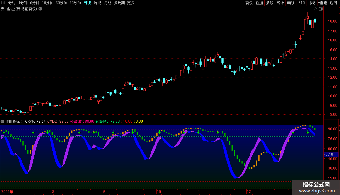 本策略依托CX1(红色)与CX2(黄色)指标线跟踪股价运行趋势,结合KD漂带指标(CXKK与CXDD线)清晰标识强弱区间,并设置0、10、78.6、88.6四条关键预警线。该系统提供明确的与交易信号:当CXKK线上穿10且其差值不超过1时,发出买入信号;持仓线超过88.6时,提示卖出预警。CXD1动能柱以红色上涨、绿色下跌直观反映动力强弱,适用于震荡行情中捕捉短线机会,也可用于筛选具备强势突破潜力的个股。
