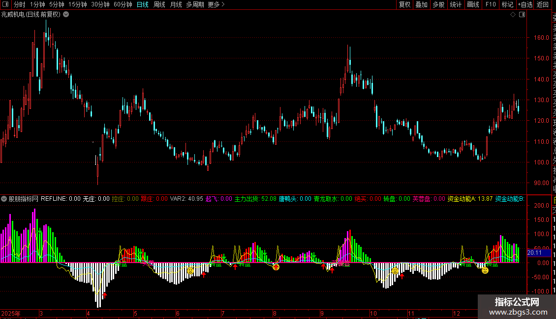 白色柱体位于水下;红柱代表跟庄信号持续;紫柱预示股价起飞信号;绿柱则表示股价回调,需保持警惕。