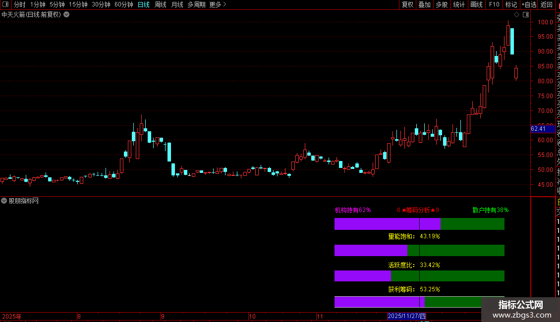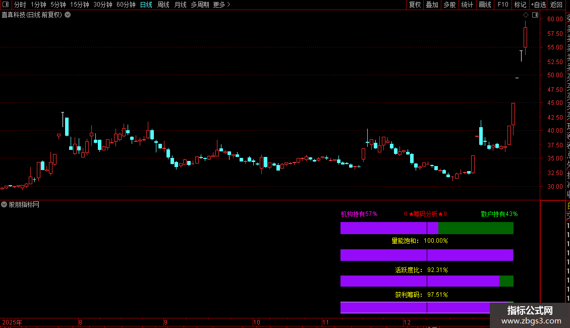 这个“筹码透市”指标不仅简单易懂,而且非常实用。它通过直观的进度条和文字描述,让家人们能够迅速把握市场的动态。举个梨子:当看到机构持仓占比的进度条比较长,且获利筹码占比适中,量能也呈现出饱和状态时,那就说明当前股价的筹码结构非常健康,是一个值得关注的优质标的。如下图所示: