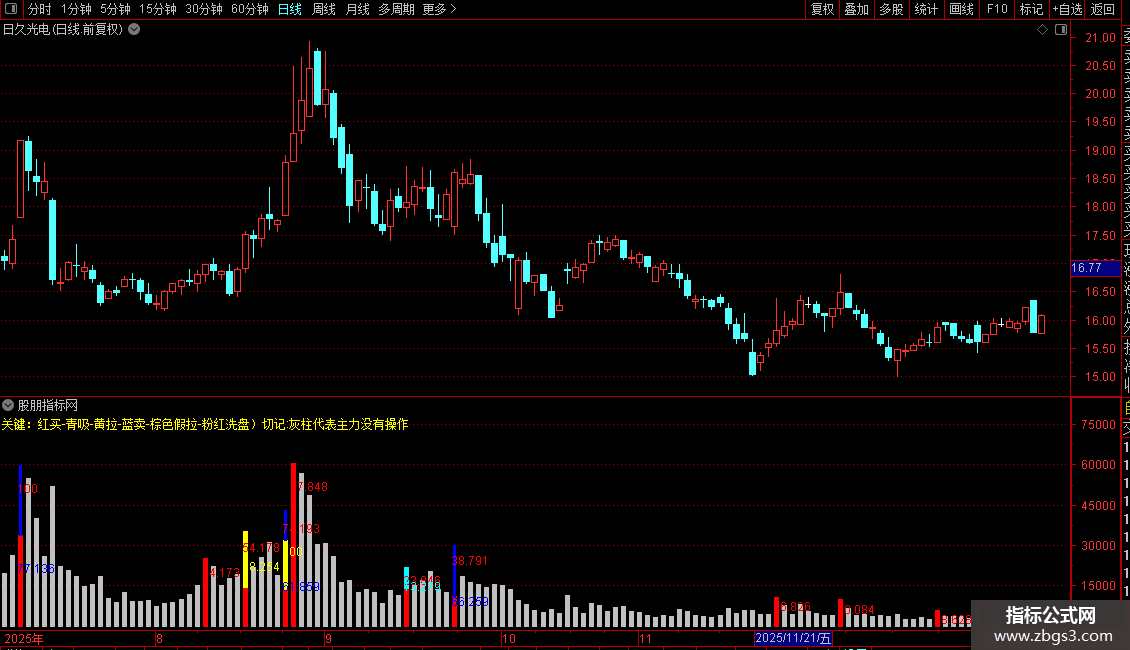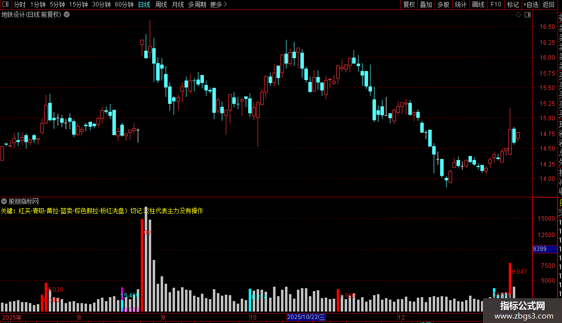 指标通过分析成交量、价格变动和K线形态,识别主力资金在不同阶段的操作行为。当出现放量阳线且涨幅适中时,视为建仓或拉升信号;低位放量阴线则判断为主力吸筹或洗盘;高位放量伴随大振幅则提示出货风险。副图以色块叠加方式直观展示各类操作强度,并标注数值辅助判断。整体策略强调结合颜色信号(红买、青吸、黄拉、蓝卖等)进行买卖决策,灰柱表示主力无明显动作。