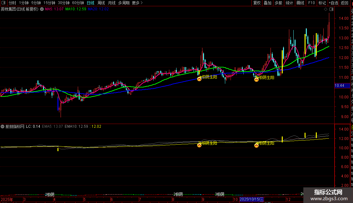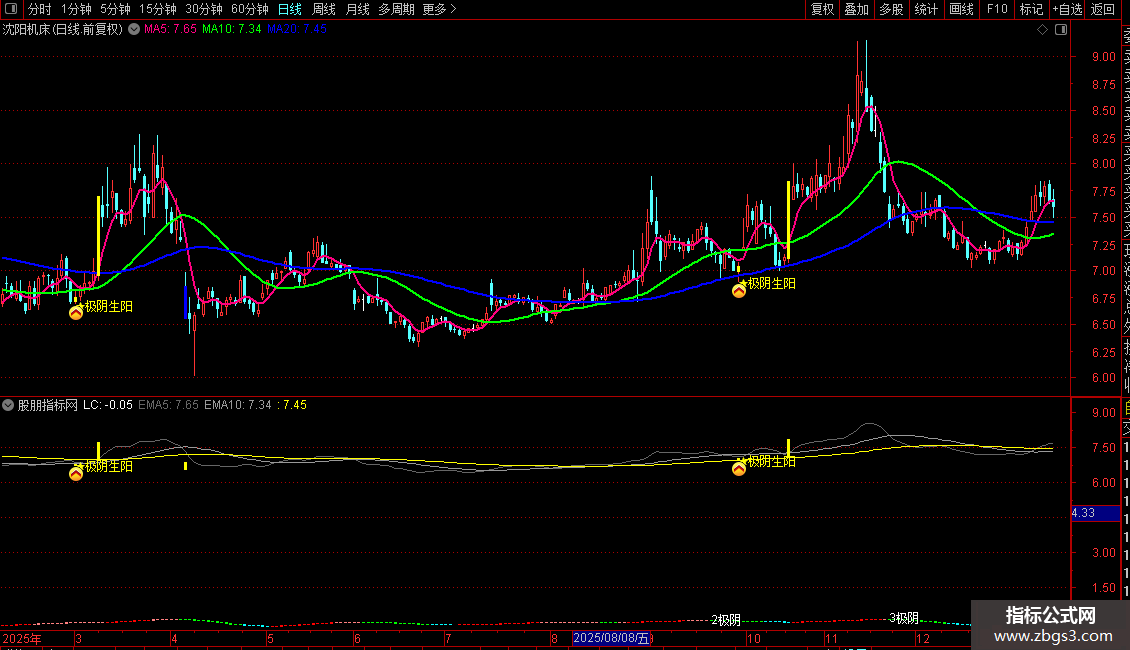1. 主图:在K线图加载后,重点关注黄色“★极阴生阳”标注,结合涨停(黄K)、大跌(蓝K)辅助判断反转时机;