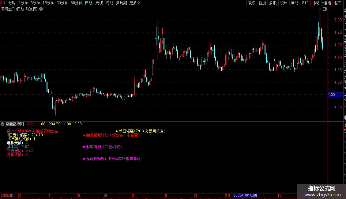 指标主要用于监控个股是否触发交易所的严重异动监管标准。它综合判断股票在短期内(如3日)相对于大盘的涨跌幅偏离程度,并结合10日内累计异动次数、是否属于主板或双创板块等因素,评估是否达到被监管或停牌的风险阈值。同时,还监测涨停封单强度、开板次数、换手率突增、量比异常等辅助信号,用于提前预警潜在的监管风险或资金异动。