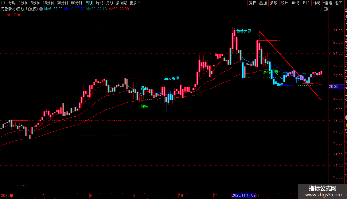 公式内置算法,能实时检测并标注出“黄昏之星”、“射击之星”、“锤头”、“穿头破脚”、“乌云盖顶”、“曙光初现”、“身怀六甲”、“倾盆大雨”等多种经典反转或持续形态,在K线对应位置直接显示文字提示,是捕捉买卖点的重要信号。