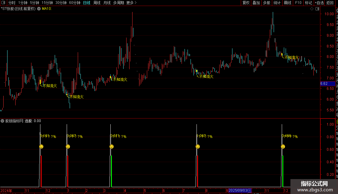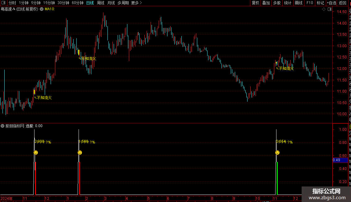 2. 文字标注:在信号K线下方显示"↖不知流火"提示