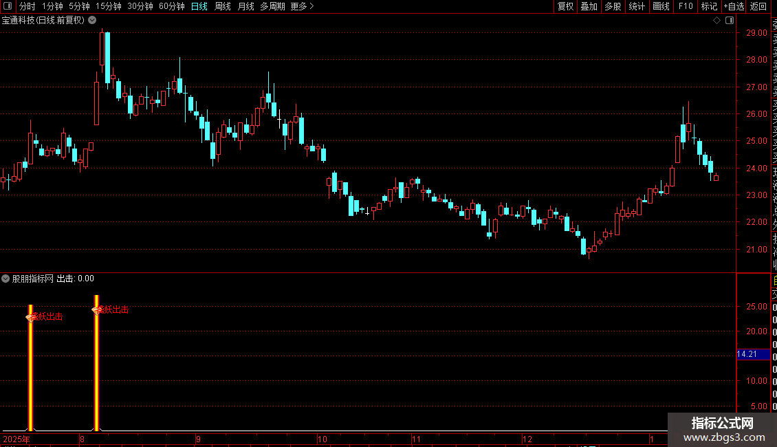 指标主要用于识别具备强势启动特征的个股。其策略核心是在股价经历低位盘整、前一日未涨停、当日开盘涨幅不过大且成交量明显放大的背景下,捕捉出现大阳线突破并站稳多条均线的买入信号。系统通过多重条件过滤,排除一字涨停或高开风险,聚焦于安全边际较高、动能充沛的“擒妖”机会,并在满足条件时给出明确的视觉提示。